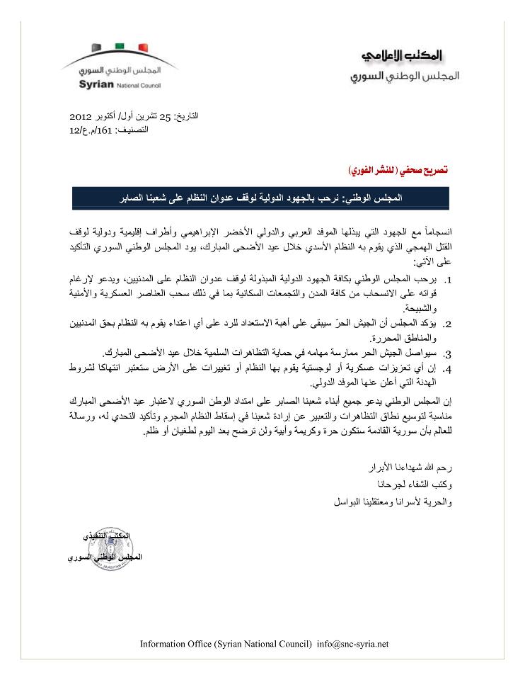 انسجاماً مع الجهود التي يبذلها الموفد العربي والدولي الأخضر الإبراهيمي وأطراف إقليمية ودولية لوقف القتل الهمجي الذي يقوم به النظام الأسدي خلال عيد الأضحى المبارك، يود المجلس الوطني السوري التأكيد على الآتي: