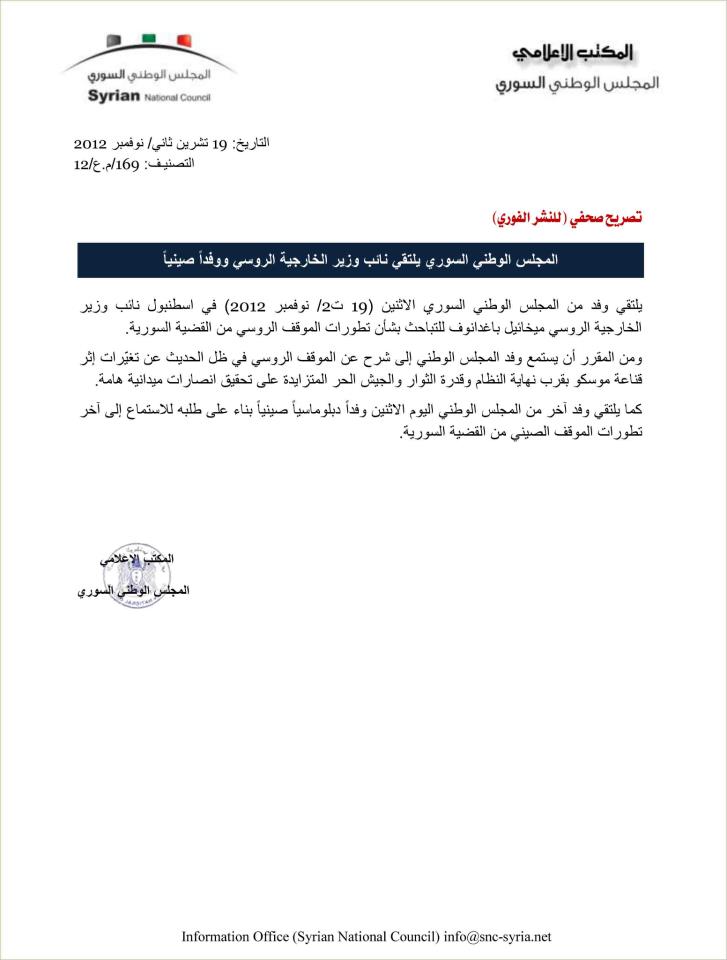 يلتقي وفد من المجلس الوطني السوري الاثنين (19 ت2/ نوفمبر 2012) في اسطنبول نائب وزير الخارجية الروسي ميخائيل باغدانوف للتباحث بشأن تطورات الموقف الروسي من القضية السورية.