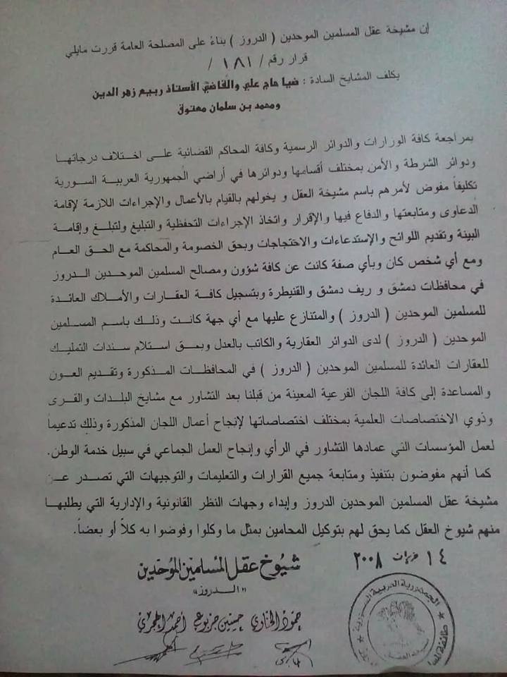 القرار 181 من دار طائفة المسلمين الموحدين الدروز في سوريا بتكيلف أشخاص لتمثيل دار مشيخة العقل في الدوائر الحكومية