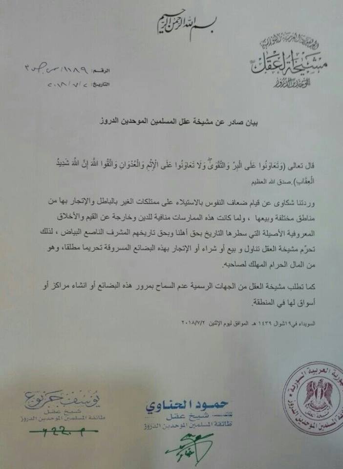 بيان صادر عن مشيخة عقل المسلمين الموحدين الدروز بتحريم سرقة مال الغير وبيعه