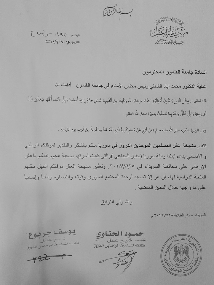 تقديراً لموقفه المشرّف أرسل سماحة شيخي عقل المسلمين الموحدين الدروز يوسف جربوع وحمود الحناوي كتاب شكر وتقدير للدكتور محمد اياد الشطي رئيس مجلس الامناء في جامعة القلمون لتقديمه منحة دراسية لابنة الجبل الطالبة حنين الجباعي .