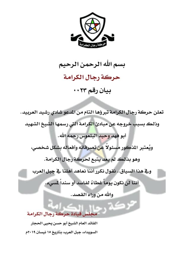 بيان من حركة رجال الكرامة تتبرأ من شادي العربيد بسبب التحاقه بعصابات الخطف والسرقة