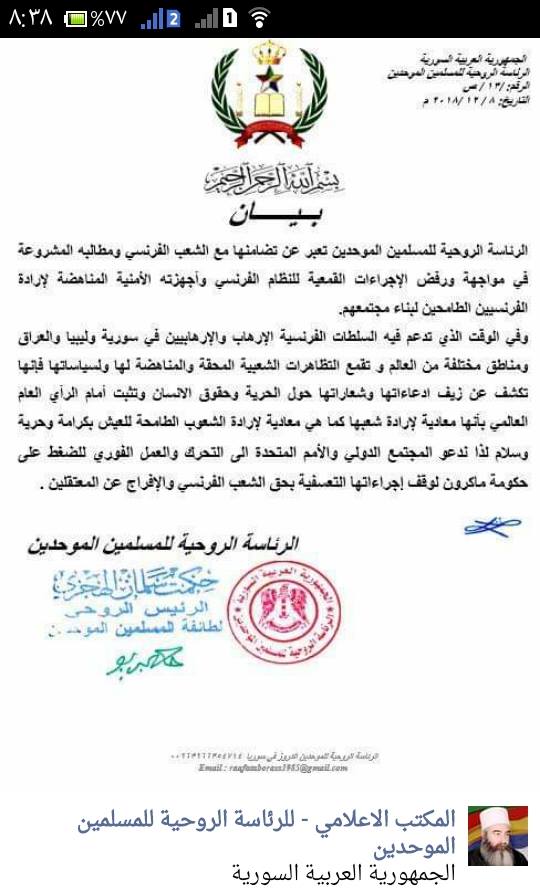 بيان تضامن من الرئاسة الروحية للمسلمين الموحدين الدروز مع الشعب الفرنسي