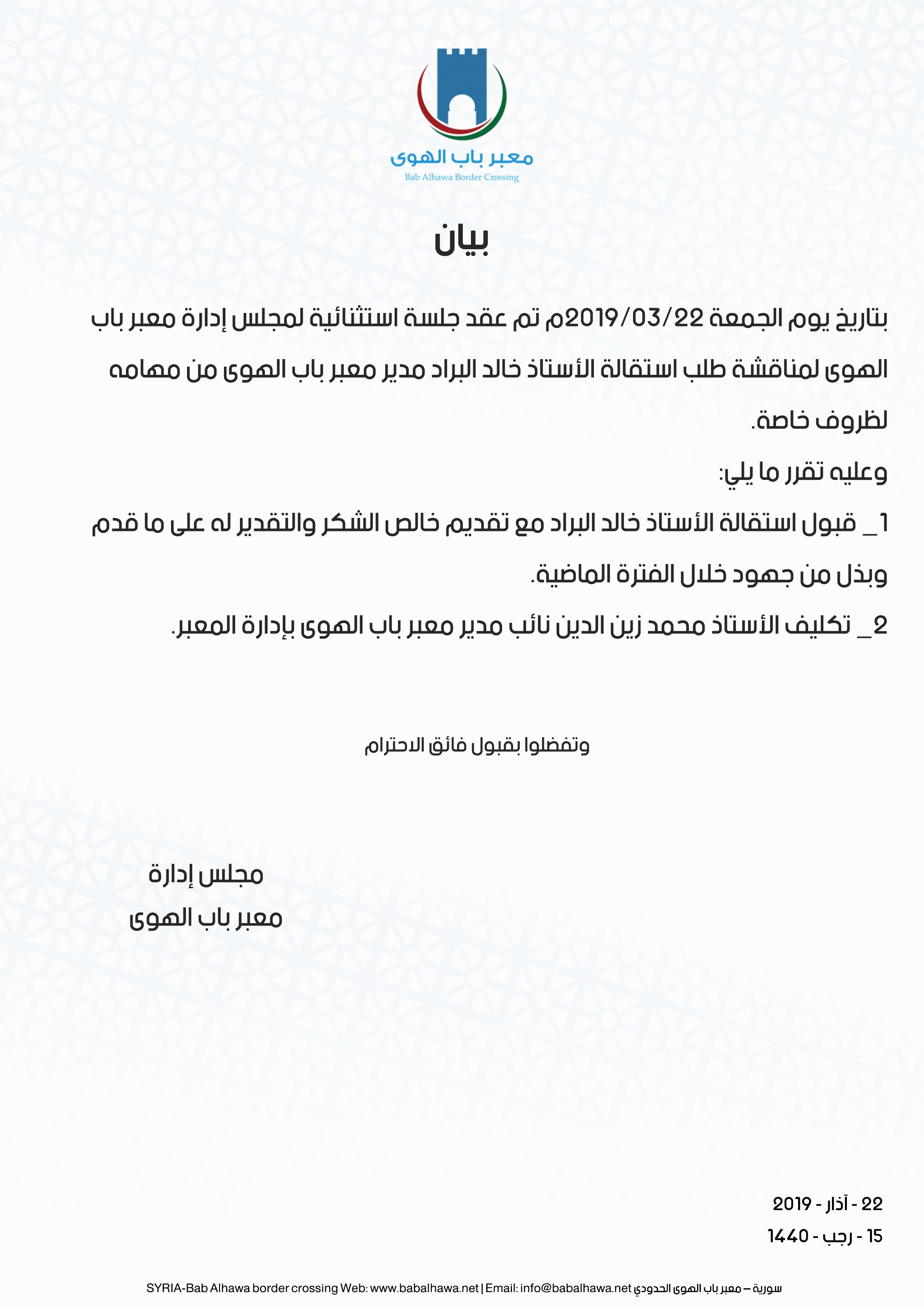 بيان صادر عن إدارة معبر باب الهوى يعن فيه قبول استقالة خالد البراد من منصبه مديراً للمعبر وتعيين محمد زين الدين خلفاً له