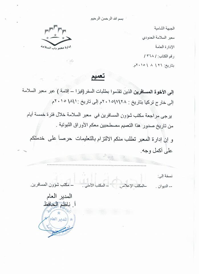 تعميم إلى الأخوة المسافرين الذين تقدموا بطلبات سفر ( فيزا - إقامة ) عبر معبر باب السلامة إلى خارج تركيا