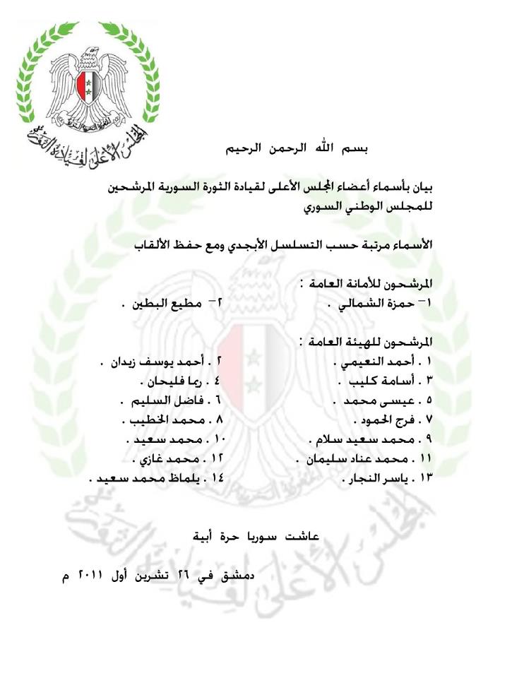 بيان بأسماء أعضاء المجلس الأعلى لقيادة الثورة السورية المرشحين للمجلس الوطني السوري