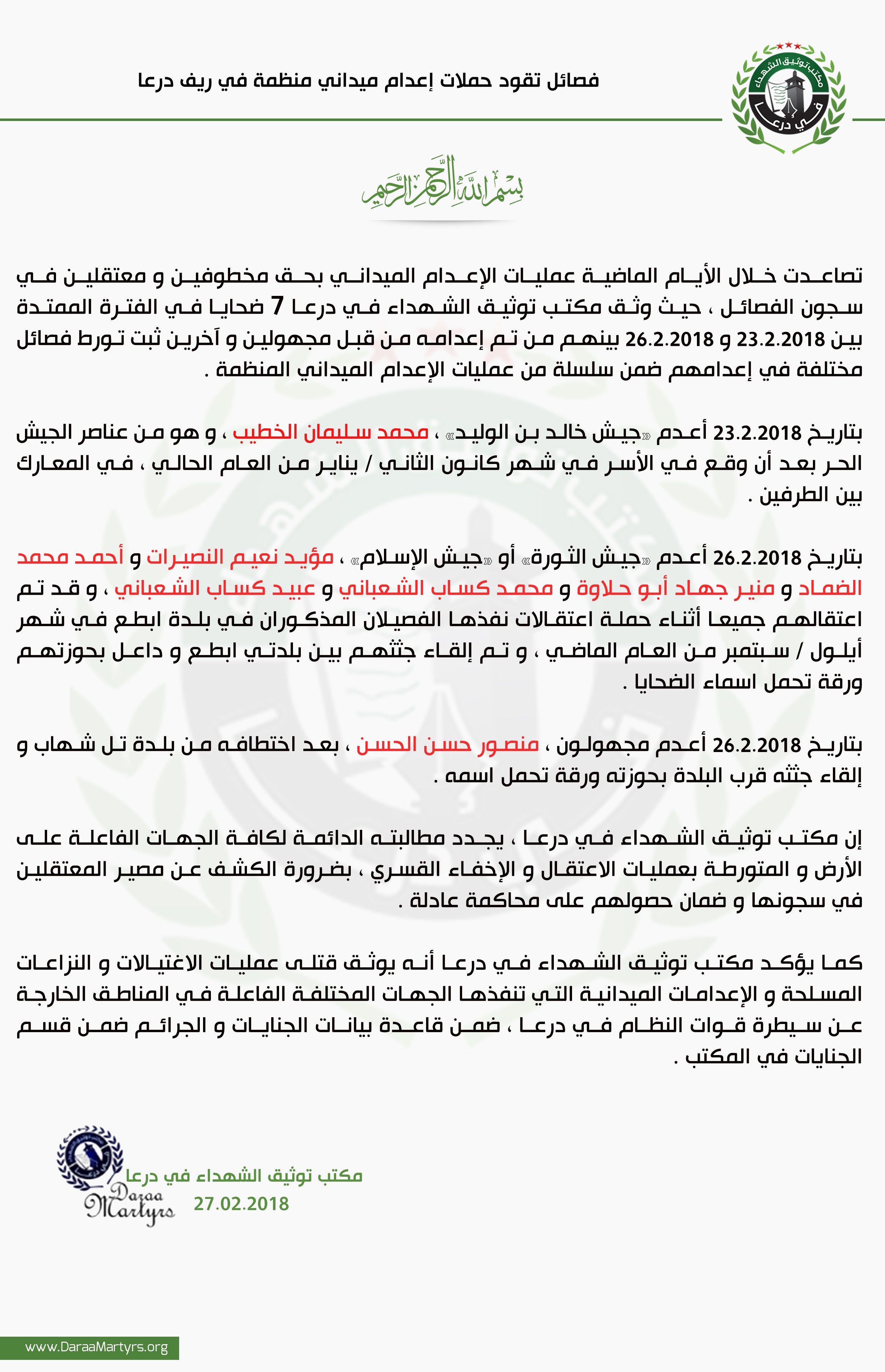 تصاعدت خلال الأيام الماضية عمليات الإعدام الميداني بحق مخطوفين و معتقلين في سجون الفصائل ، حيث وثق مكتب توثيق الشهداء في درعا 7 قتلى في الفترة الممتدة بين 23.2.2018 و 26.2.2018 بينهم من تم إعدامه من قبل مجهولين و آخرين ثبت تورط فصائل مختلفة في إعدامهم ضمن سلسلة من عمليات الإعدام الميداني المنظمة .