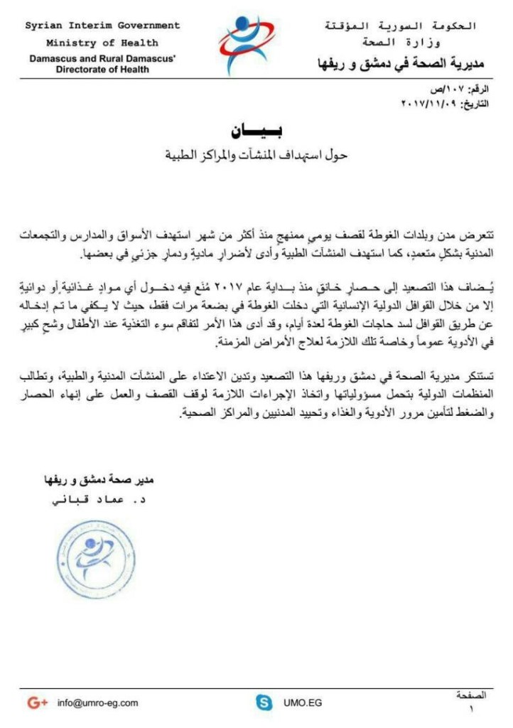 الصحة الحرة بدمشق تصدر بياناً حول استهداف المنشئات الطبية وتطالب بالتحرك