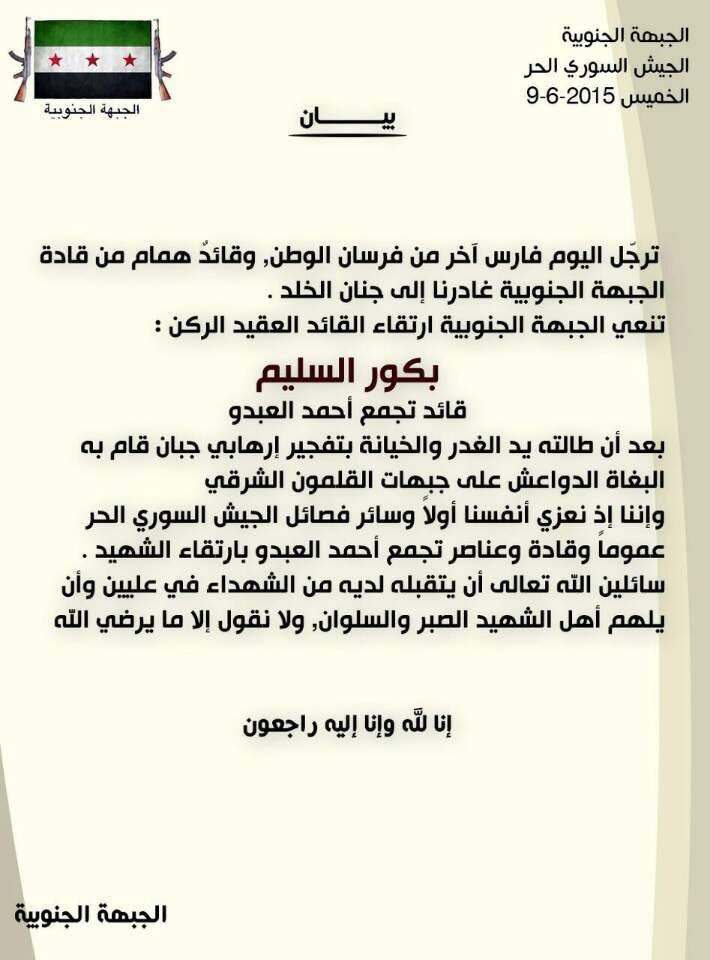 الجبهة الجنوبية في الجيش الحر تنعي العقيد الركن بكور السليم