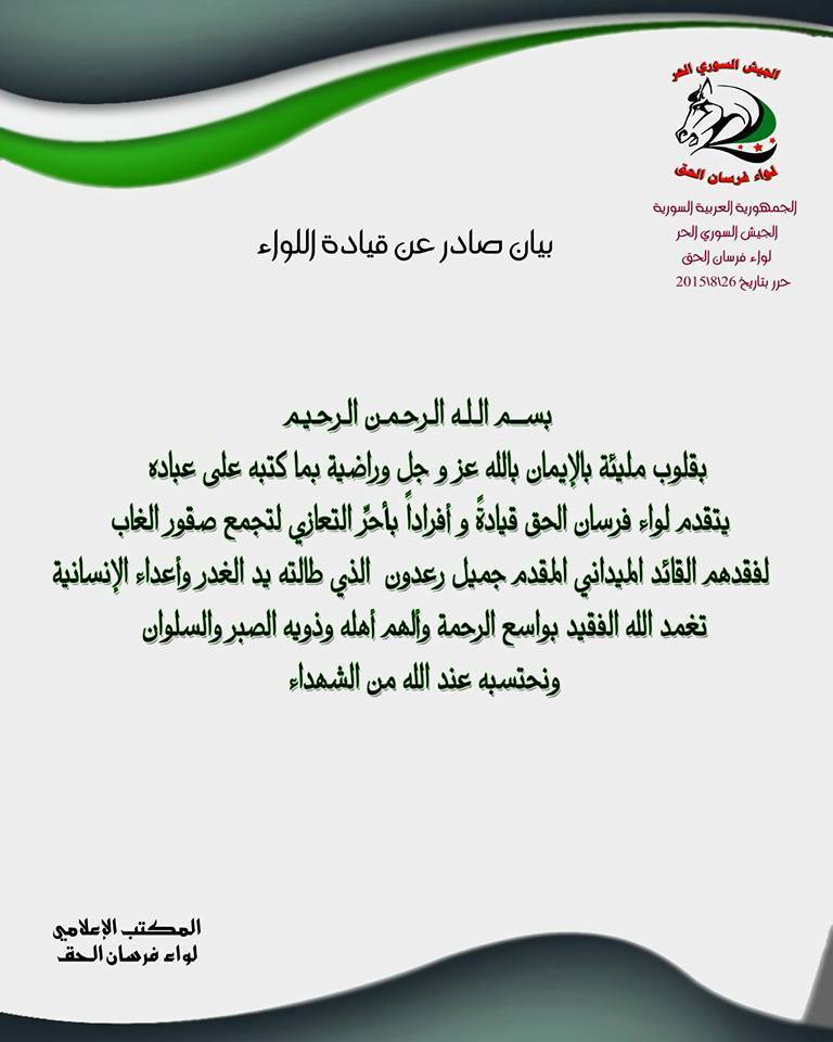 لواء فرسان الحق يعزّي بقائد تجمع صقور الغاب جميل رعدون الذي قصى في عملية اغتيال في مدينة أنطاكيا التركية