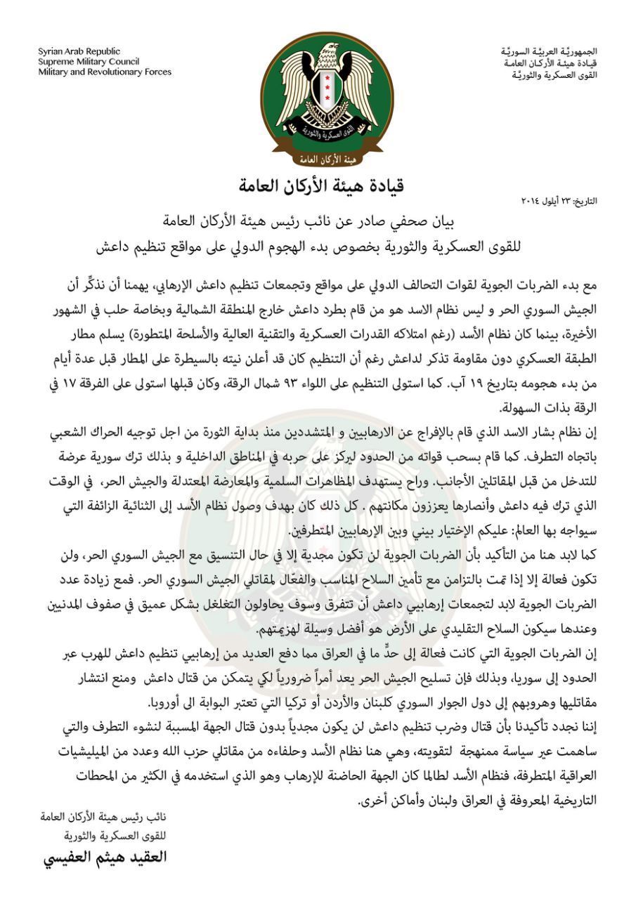 بيان صحفي صادر عن نائب رئيس هيئة الأركان العامة للقوى العسكرية والثورية بخصوص بدء الهجوم الدولي على مواقع تنظيم داعش
