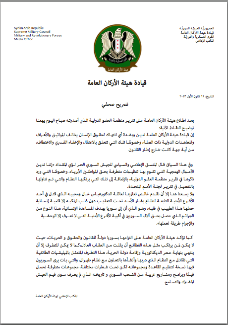 بعد اطلاع هيئة الأركان العامة على تقرير منظمة العفو الدولية الذي أصدرته صباح اليوم يهمنا توضيح النقاط الآتية