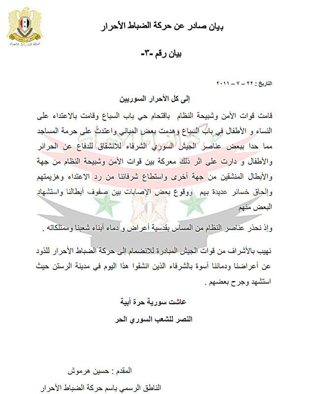 نهيب بالأشراف من قوات الجيش المبادرة للانضمام إلى حركة الضباط الأحرار للذود عن أعراضنا ودمائنا أسوة بالشرفاء الذين انشقوا هذا اليوم في مدينة الرستن حيث