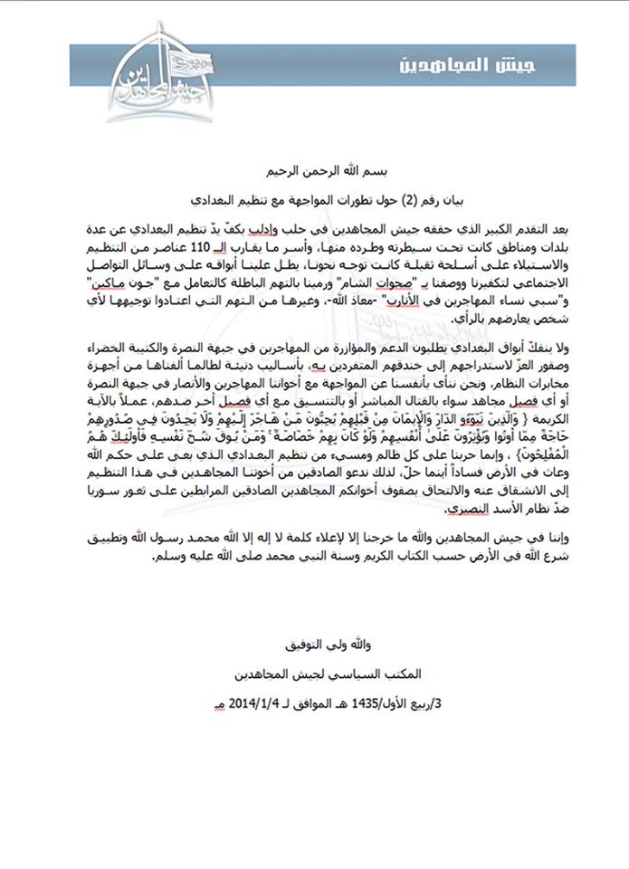 بيان رقم 2 الصادر عن جيش المجاهدين ببغي تنظيم البغدادي على حكم الله ويطالب الصادقين فيه بالانشقاق