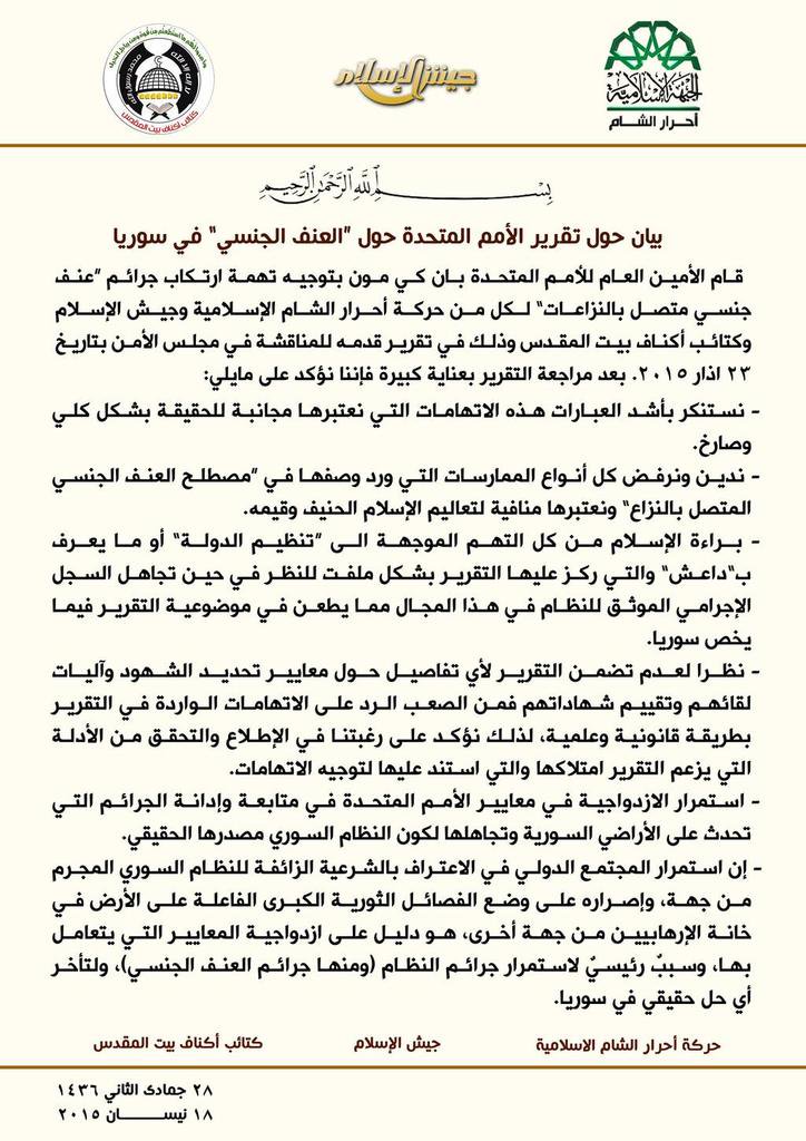 بيان مشترك من أحرار الشام وجيش الإسلام وأكناف بيت المقدس لإدانة واستنكار تقرير الأمم المتحدة حول العنف الجنسي في سوريا