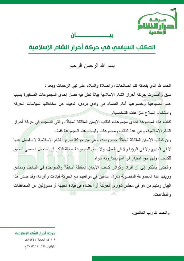 بيان بخصوص فصل كتائب الإيمان المقاتلة التابعة لحركة أحرار الشام الإسلامية في ريف دمشق