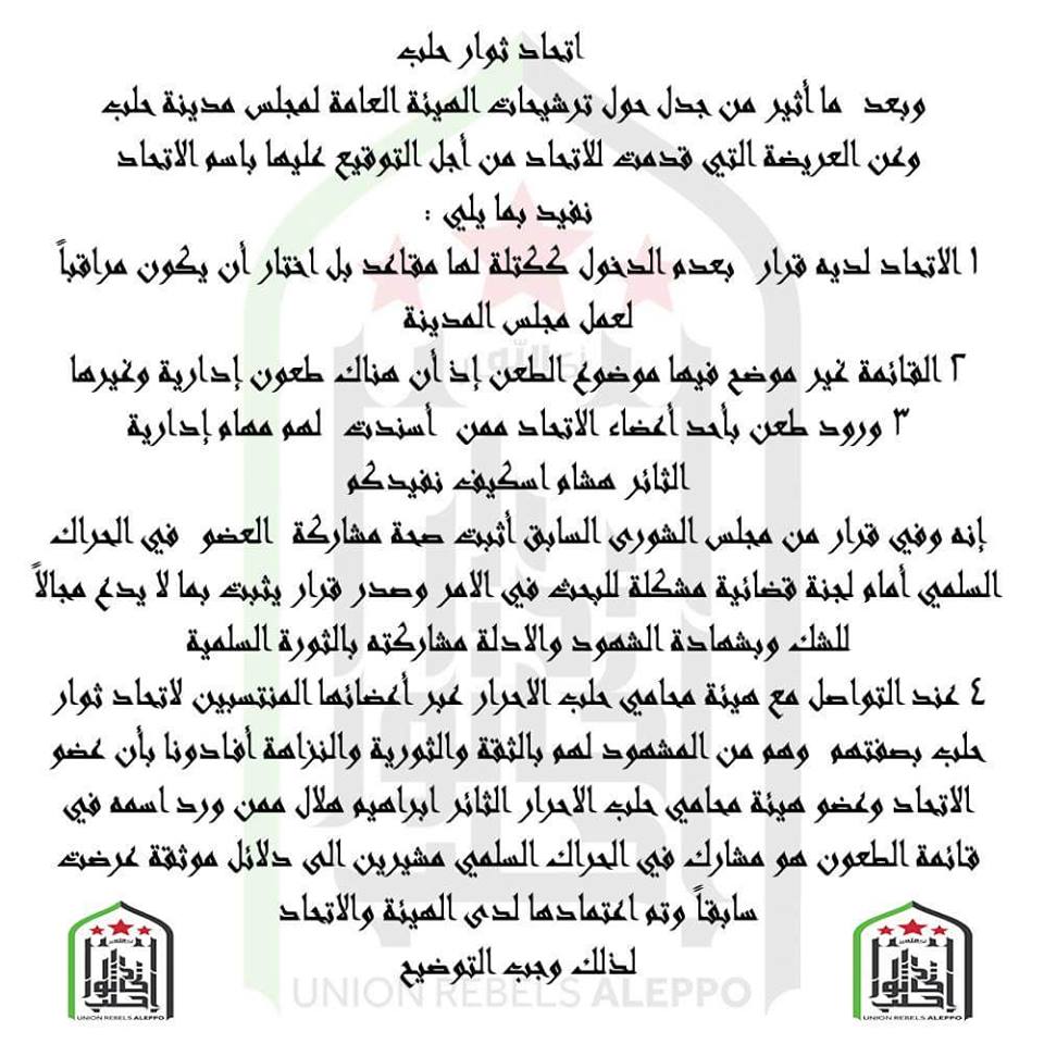بيان اتحاد ثوار حلب حول الترشيحات للهيئة العامة لمجلس المدينة