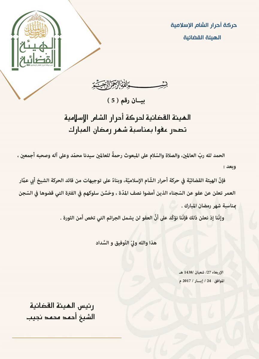 الهيئة القضائية لحركة أحرار الشام الإسلامية تصدر عفواً بمناسبة شهر رمضان المبارك