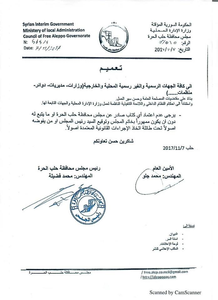 تعميم صادر عن مجلس محافظة حلب الحرة بعدم اعتماد أي كتاب يصدر عن مجلس المحافظة إذا لم يكن ممهوراً بختم المجلس وتوقيع رئيس المجلس