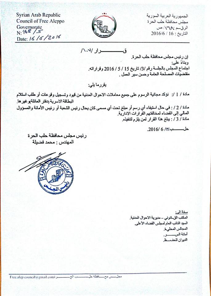 اصدر السيد رئيس مجلس محافظة حلب الحرة قراراً يؤكد فيه على مجانية الرسوم على جميع معاملات الاحوال المدنية من قيود وتسجيل وقوعات او طلب استلام البطاقة الاسرية او غيرها وفي حال استيفاء اي رسم او مبلغ تحت اي مسمى كان يحال رئيس الشعبة او رئيس الامانة والمسؤول المالي الى القضاء لمخالفتهم القرارات الادارية