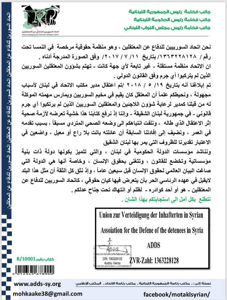بيان موجه إلى الحكومة اللبنانية من إتحاد السوريين للدفاع عن المعتقلين بخصوص إعتقال مدير الإتحاد في لبنان
