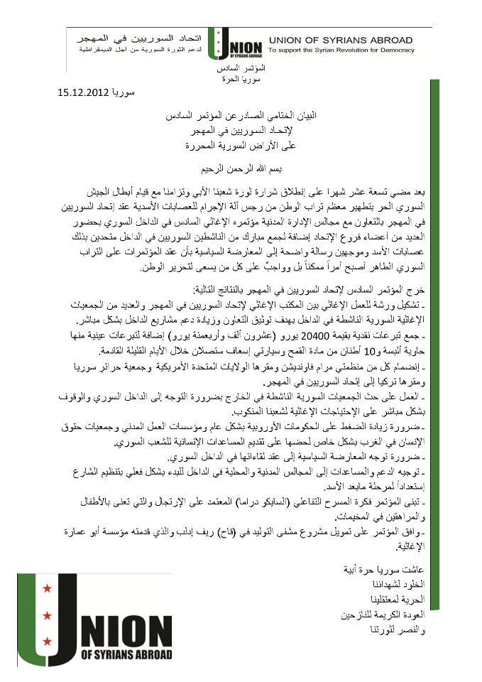 البيان الختامي الصادر عن المؤتمر السادس لإتحاد السوريين في المهجر