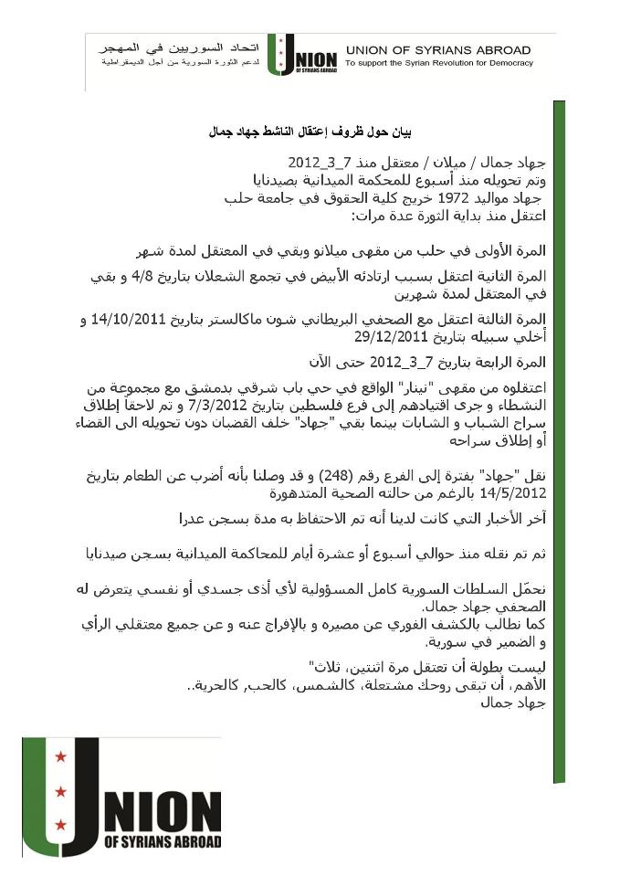 بيان حول ظروف اعتقال الناشط جهاد جمال