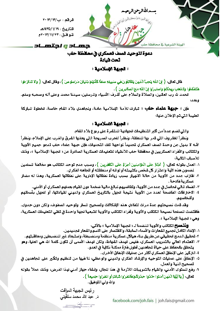 ونظراً للظروف التي تمر بها المنطقة، ونظراً للحرب الصريحة التي يعلنها الشرق والغرب على الإسلام، ونظراً لأنه لا بديل عن وحدة الصف العسكري تحديداً لمواجهة تلك التحديات، فإن جبهة علماء حلب تدعو جميع الألوية والكتائب والأفراد العسكريين في محافظة حلب للانقياد للتعليمات العسكرية الصادرة عن ” الجبهة الإسلامية “، وذلك للأسباب التالية: