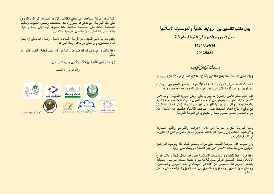 بيان الهيئة العامة للعلماء المسلمين في سوريا بالاشتراك مع مكتب التنسيق بين الروابط والهيئات الشرعية في سوريا حول مجزرة السلاح الكيماوي في الغوطة الشرقية: