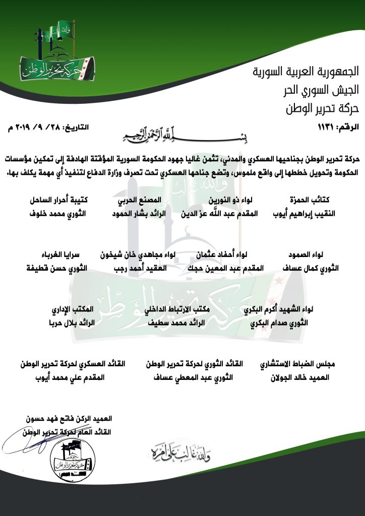 حركة تحرير الوطن بجناحيها العسكري والمدني، تثمن غاليا جهود الحكومة السورية المؤقتة وتضع جناحها العسكري تحت تصرف وزارة الدفاع لتنفيذ أي مهمة يكلف بها