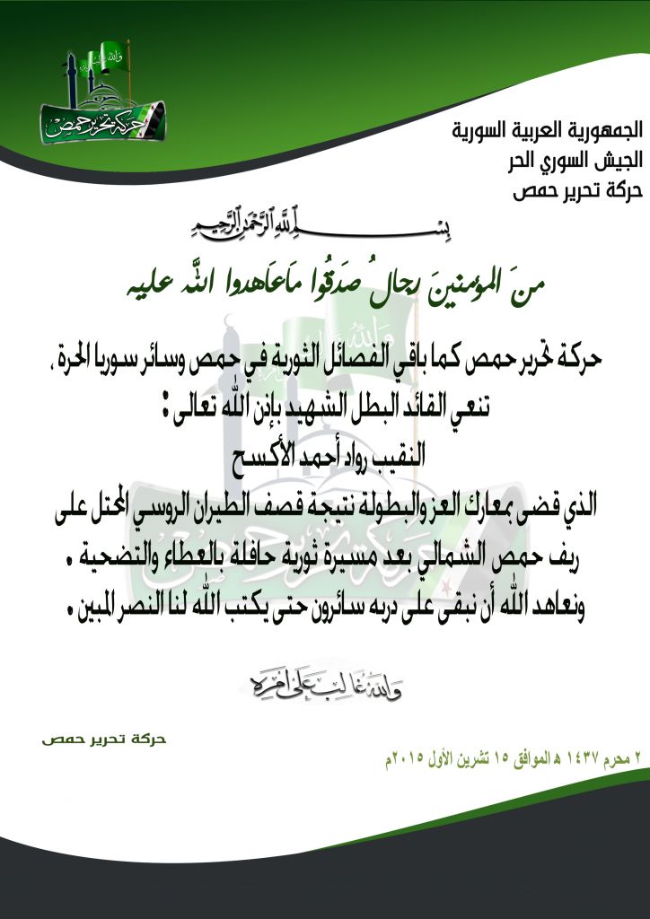 الجمهورية العربية السورية الجيش السوري الحر حركة تحرير حمص بسم الله الرحمن الرحيم من المؤمنين رجال صدقوا ما عاهدوا الله حركة تحرير حمص كما باقي الفصائل الثورية في حمص وسائر سورية الحرة ، القائد البطل الشهيد بإذن الله تعالى النقيب رواد أحمد الأكسح الذي قضى بمعارك العز والبطولة نتيجة قصف الطيران الروسي المحتل على ريف حمص الشمالي بعد مسيرة ثورية حافلة بالعطاء والتضحية .ونعاهد الله أن نبقى على دربه سائرون حتى يكتب الله لنا النصر المبين والله غالب على أمره حركة تحرير حمص 2 محرم 1437 للهجرة الموافق 15 تشرين الأول 2015م
