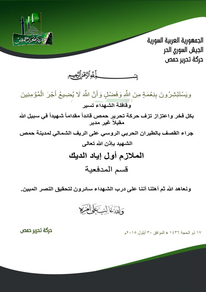 حركة تحرير حمص تنعي الشهيد الملازم أول إياد الديك