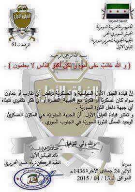 بيان الفيلق الأول التابع للجبهة الجنوبية في درعا بمقاطعة جبهة النصرة