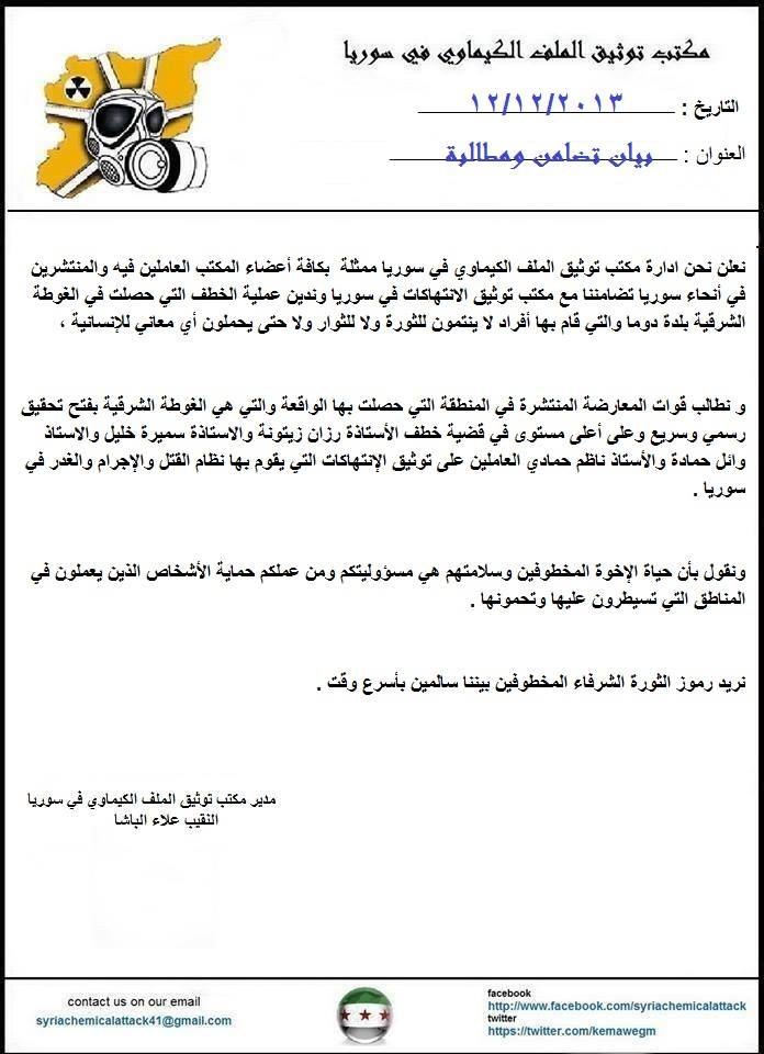 نعلن نحن ادارة مكتب توثيق الملف الكيماوي في سوريا ممثلة بكافة أعضاء المكتب العاملين فيه والمنتشرين في أنحاء سوريا تضامننا مع مكتب توثيق الانتهاكات في سوريا وندين عملية الخطف التي حصلت في الغوطة الشرقية بلدة دوما والتي قام بها أفراد لا ينتمون للثورة ولا للثوار ولا حتى يحملون أي معاني للإنسانية .