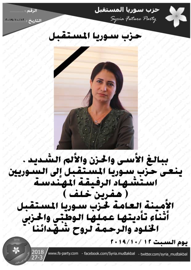 حزب سوريا المستقبل ينعي هفرين الخلف الأمينة العامة للحزب
