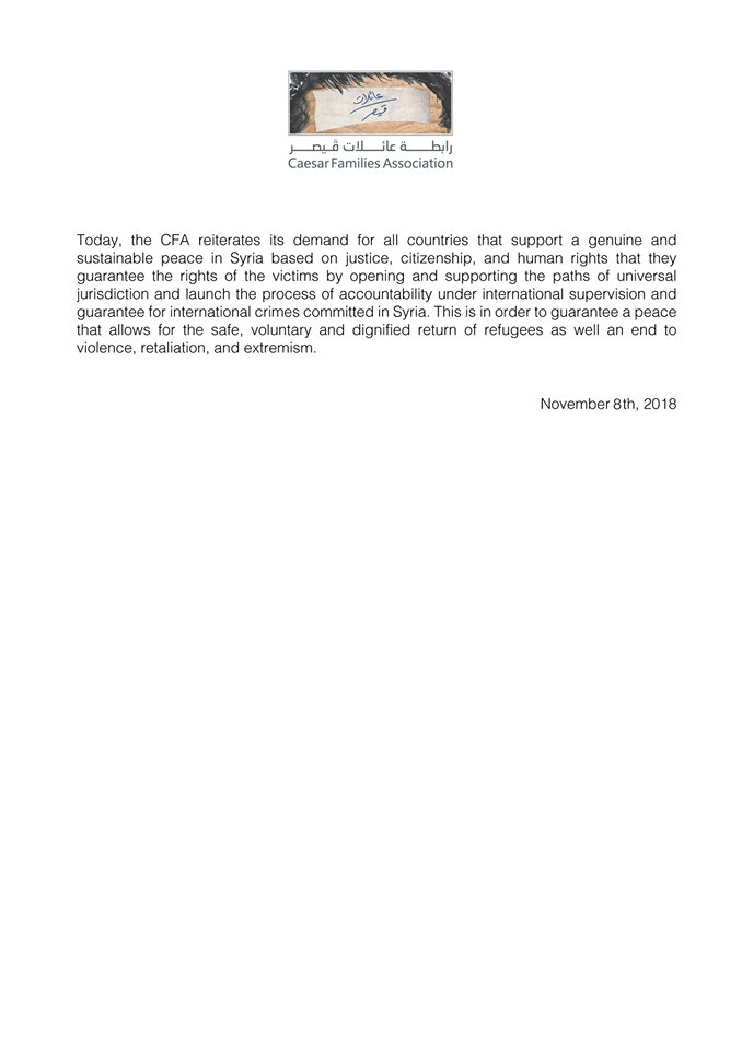 ترحب رابطة عائلات قيصر بقرار النيابة العامة الفرنسية اصدار مذكرات توقيف دولية الاثنين الماضي بحق ثلاثة ضباط بارزين من الأجهزة الأمنية السورية لمسؤوليتهم ومشاركتهم في جرائم الإخفاء القسري، التعذيب، والقتل خارج نطاق القانون، وتؤكد أن القرار هو ثمرة إيمان أسرة الضحايا وسعيهم المتواصل نحو العدالة والمحاسبة الى جانب جهود المنظمات الحقوقية الفرنسية والسورية، وتؤكد الرابطة على ضرورة تكاتف كافة القوى والدول المؤمنة بالعدالة وحقوق الإنسان، لدعم الضحايا وعوائلهم في سعيهم نحو المحاسبة وإطلاق عملية محاسبة حقيقية بإشراف وضمانة دولية تؤسس لسلام مستدام في سوريا.