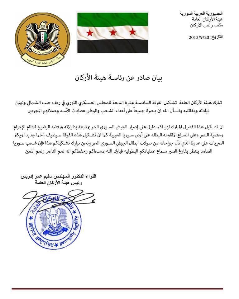 رئاسة هيئة الأركان العامة تبارك تشكيل الفرقة 16 في ريف حلب الشمالي