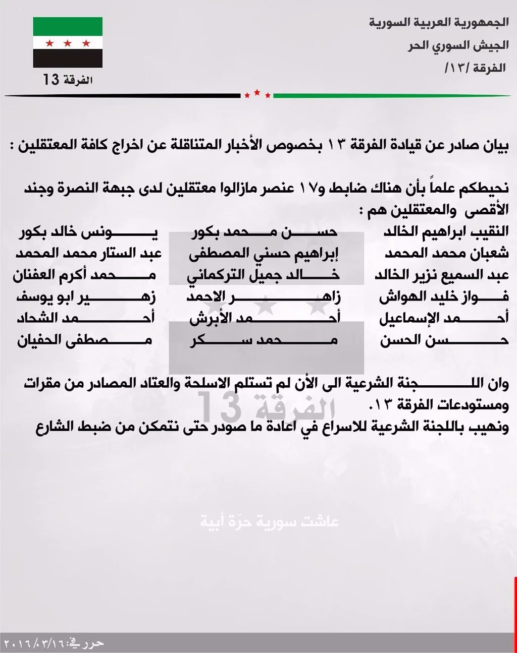 بيان من الفرقة 13 حول الأخبار المتناقلة عن إخراج جميع المعتقلين من سجون النصرة وجند الأقصى