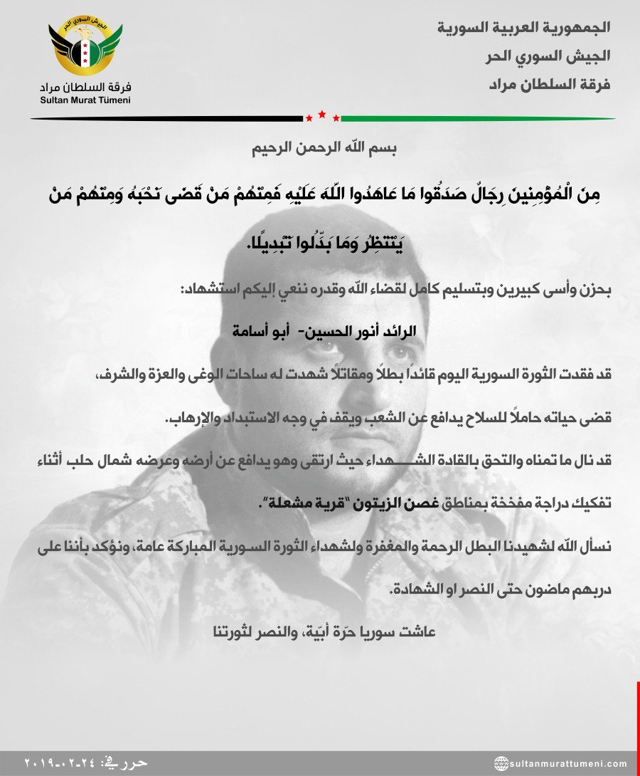 فرقة السطان مراد تنعي الرائد أنور الحسين أثناء قيامه بتفكيك دراجة نارية بريف عفرين