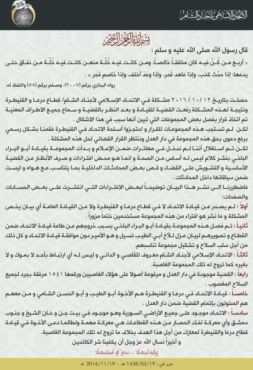 بيان من الإتحاد الإسلامي لأجناد الشام حول الإشكال الحاصل في قطاع درعا والقنيطرة