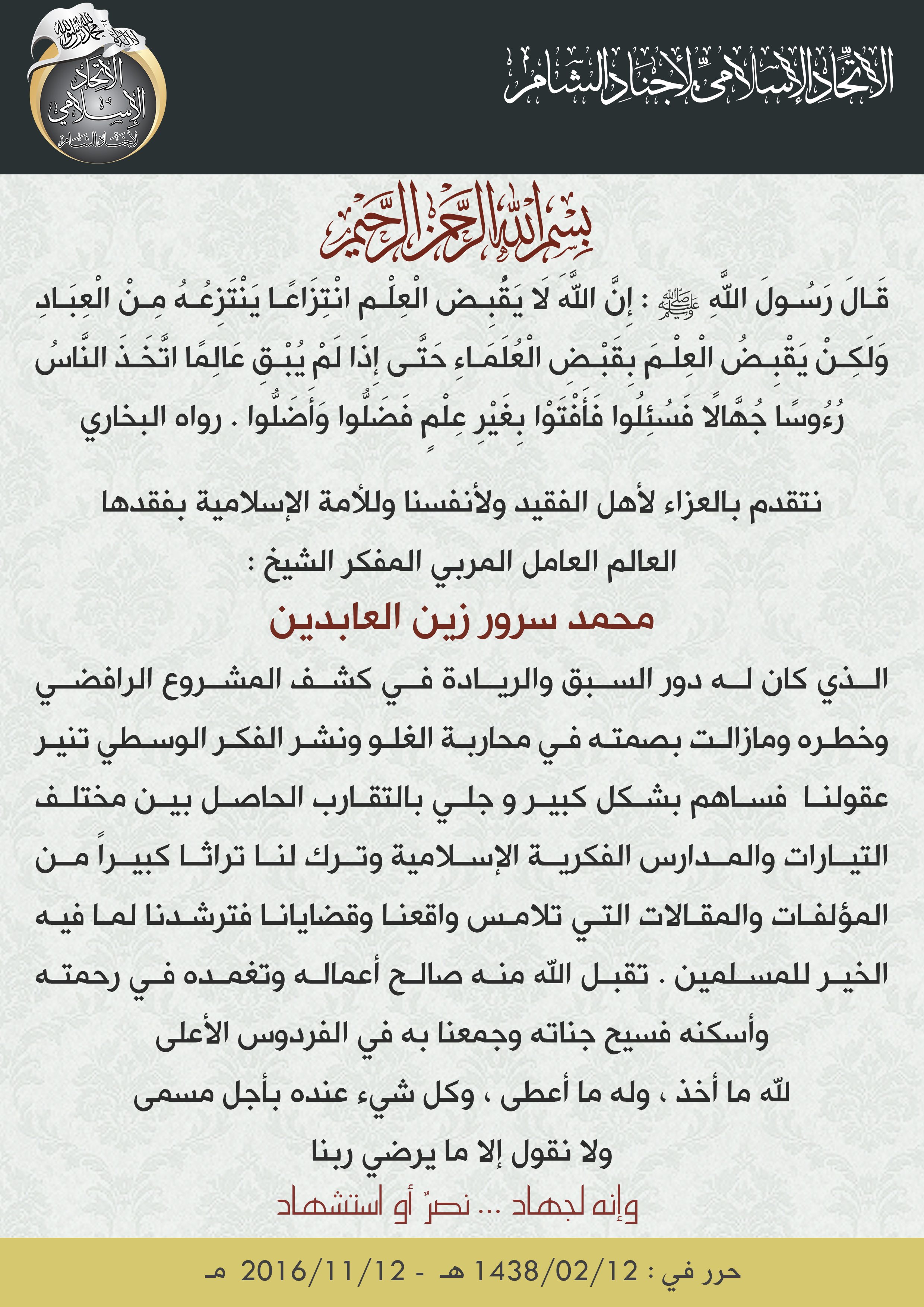 بيان تعزية من الإتحاد الإسلامي لأجناد الشام بوفاة الشيخ محمد سرور زين العابدين