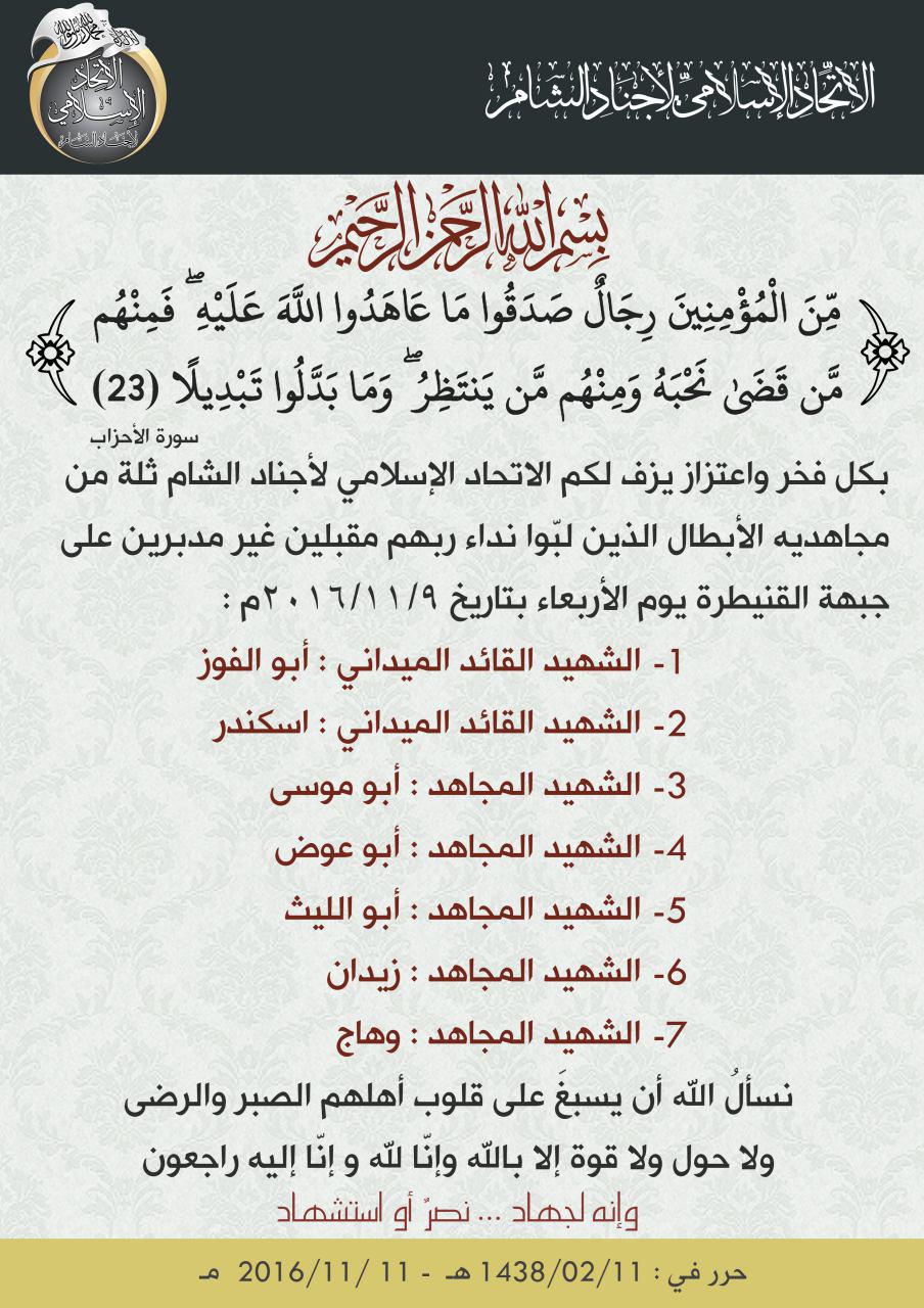 الإتحاد الإسلامي لأجناد الشام ينعي عدداً من مقاتليه على جبهات القنيطرة