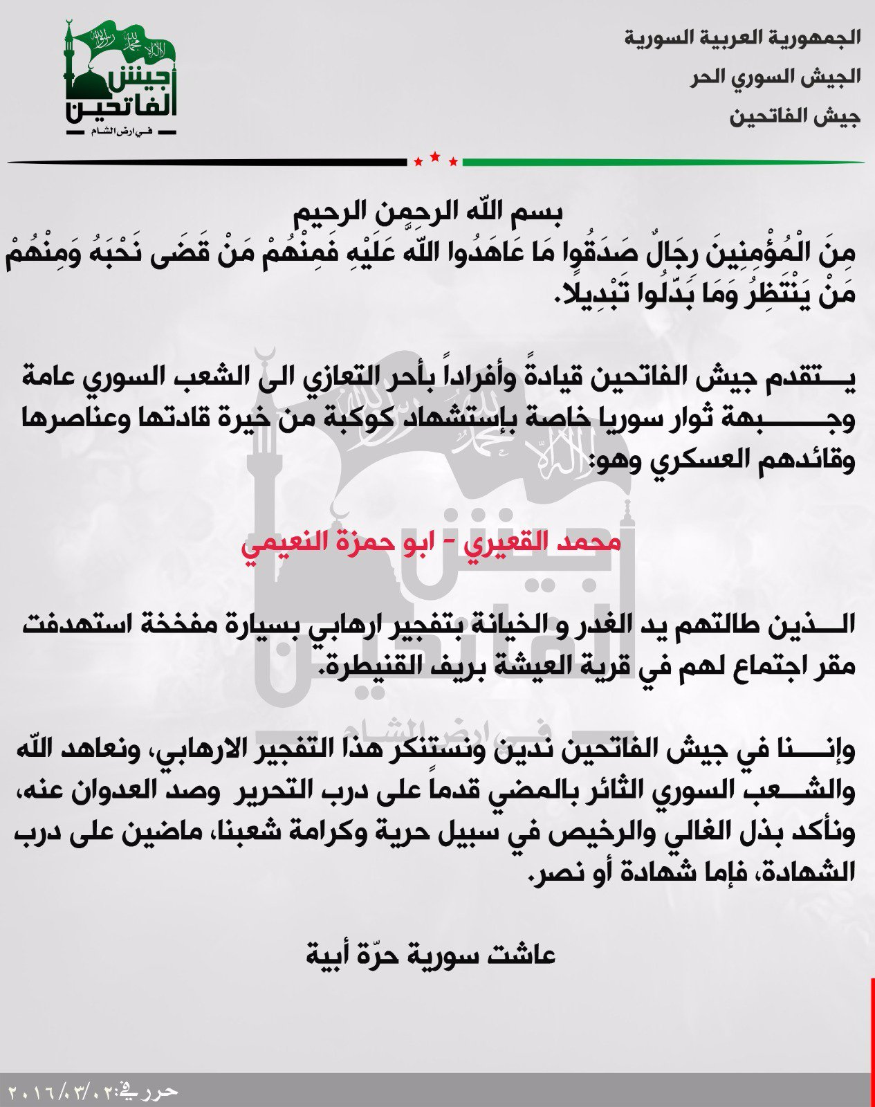 جيش الفاتحين يعزي جبهة ثوار سوريا بقائدها العسكري محمد القعيري وعددٌ من قادتها بمفخخة استهدفت اجتماعاً لهم في ريف القنيطرة
