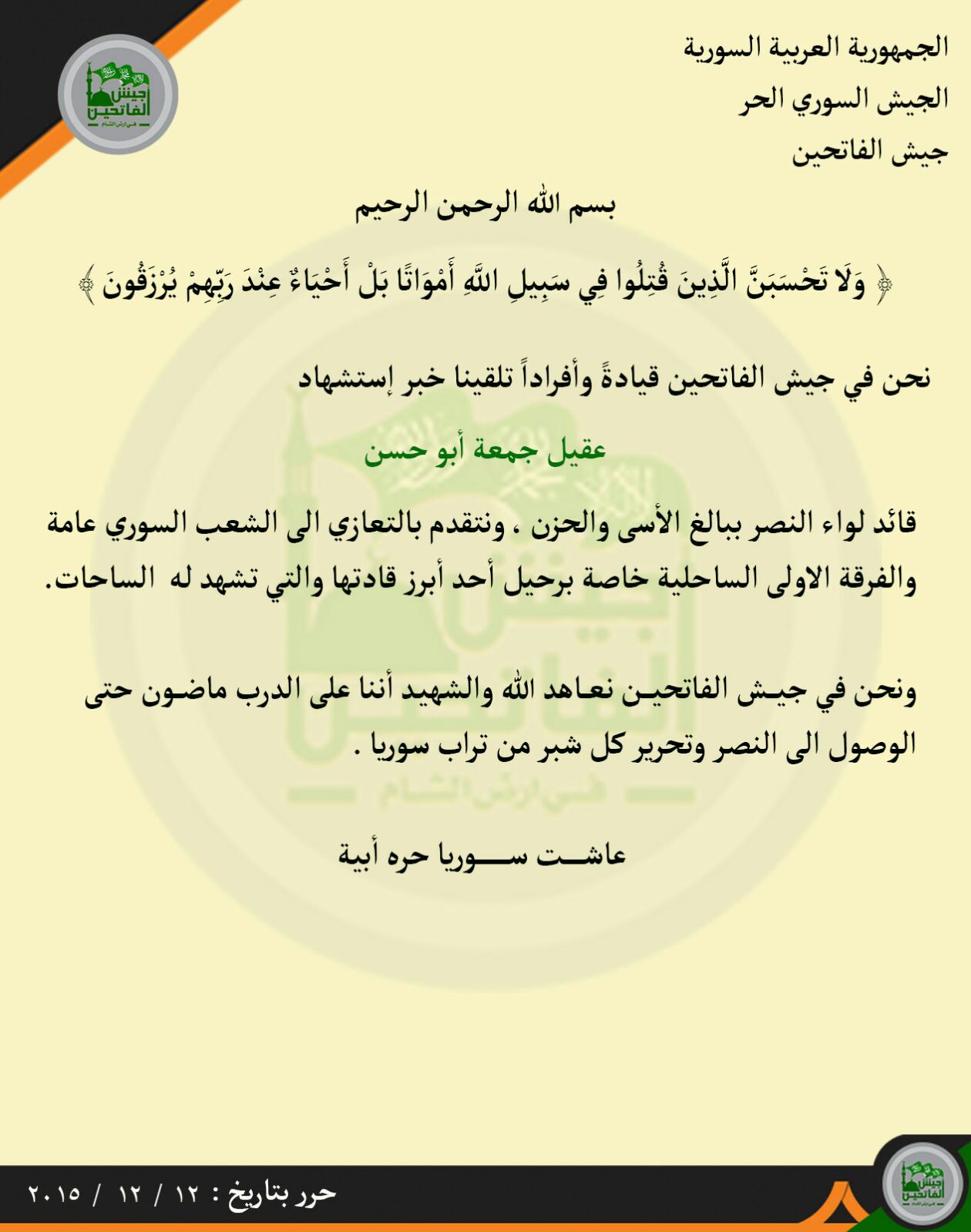 جيش الفاتحين يعزي الفرقة الأولى الساحلية بالقائد عقيل جمعة