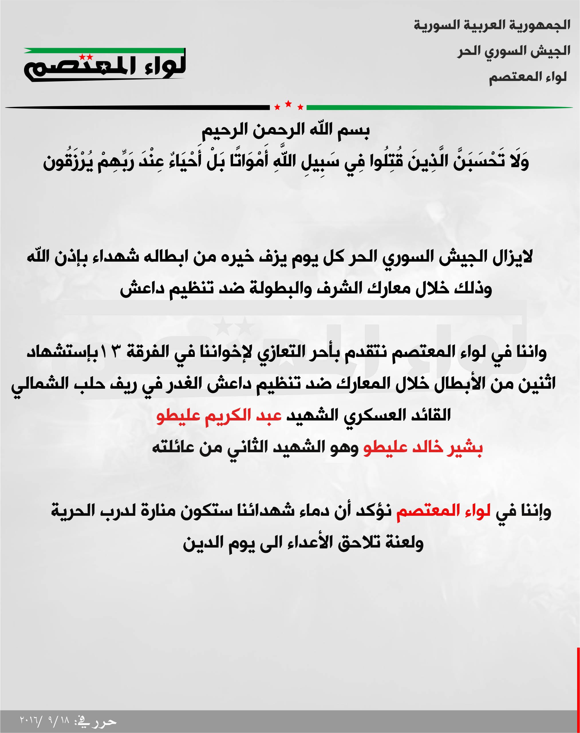 لواء المعتصم يعزي الفرقة 13 بالقائد العسكري لديها عبد الكريم عليطو خلال معارك ريف حلب الشمالي ضد تنظيم الدولة