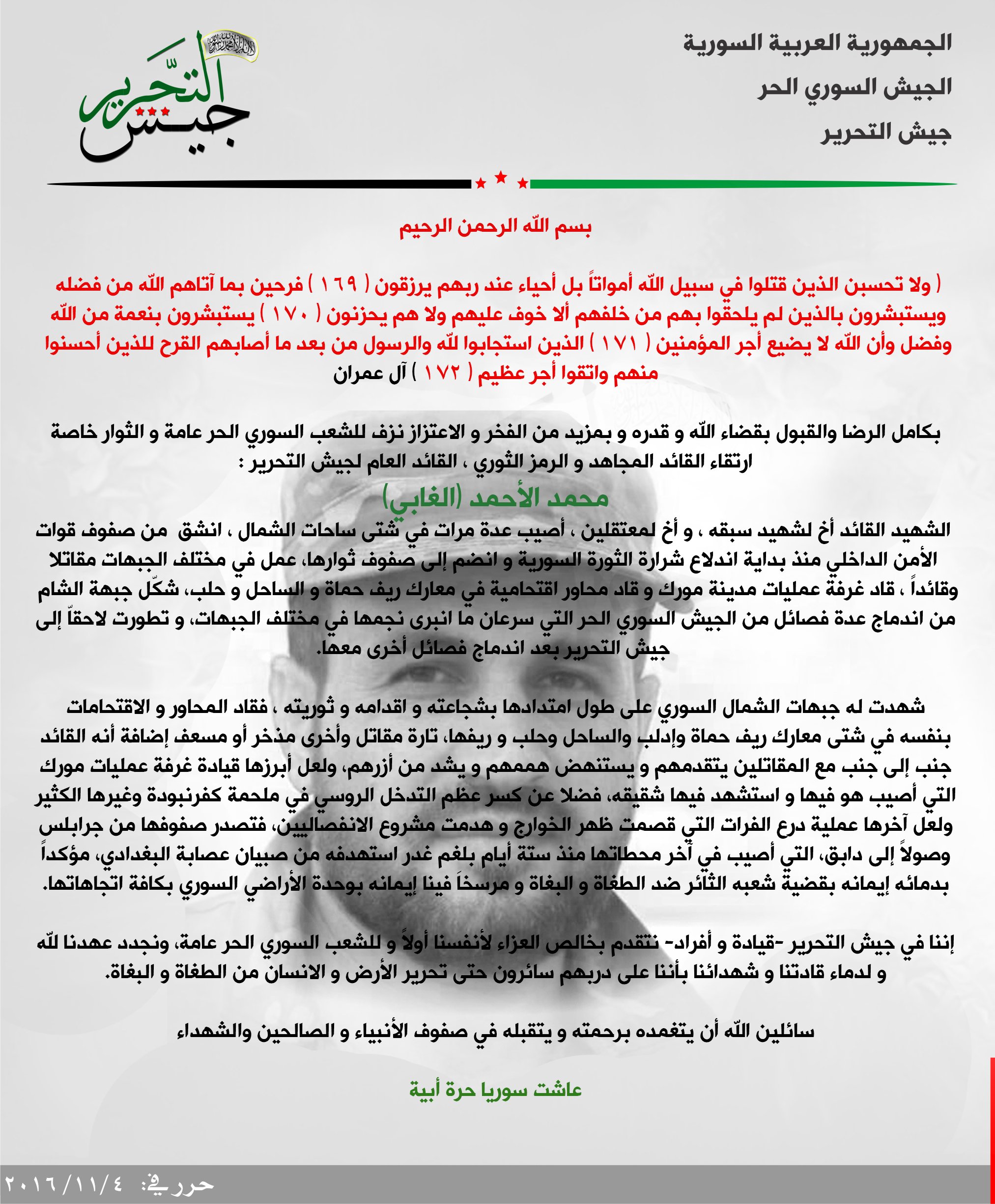 جيش التحرير ينعي قائده العام محمد الأحمد الغابي جراء إصابته في معارك ريف حلب الشمالي ضد تنظيم الدولة