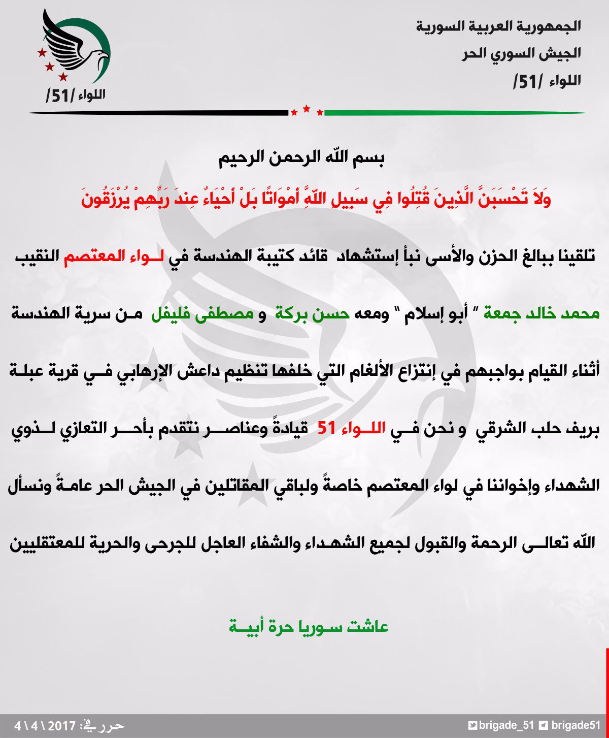 اللواء 51 يعزي لواء المعتصم بقائد كتيبة الهندسة لديه النقيب محمد خالد جمعة أثناء قيامه بفك ألغام زرعها تنظيم الدولة