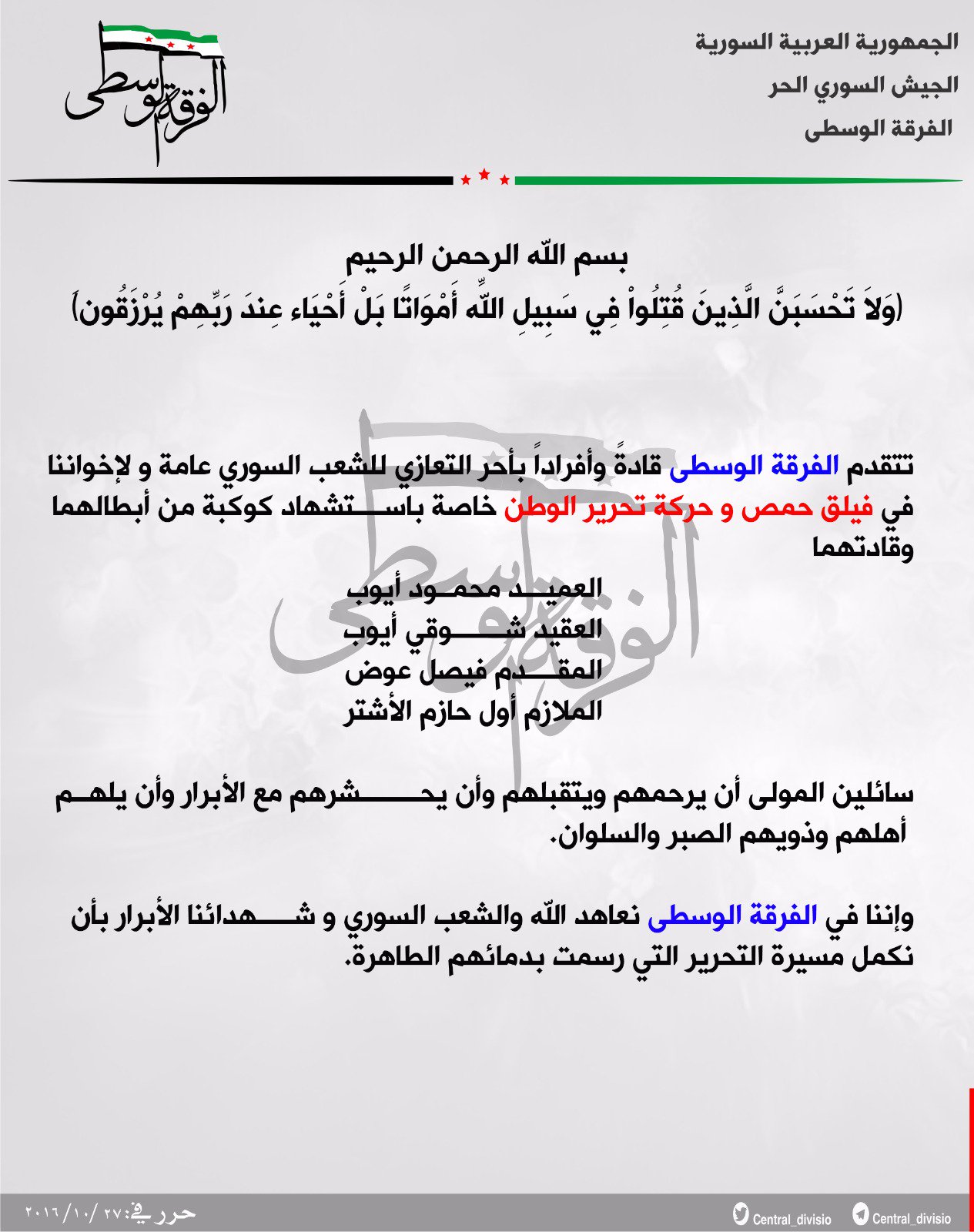 الفرقة الوسطى تعزي فيلق حمص وحركة تحرير وطن بعدد من قادتهم