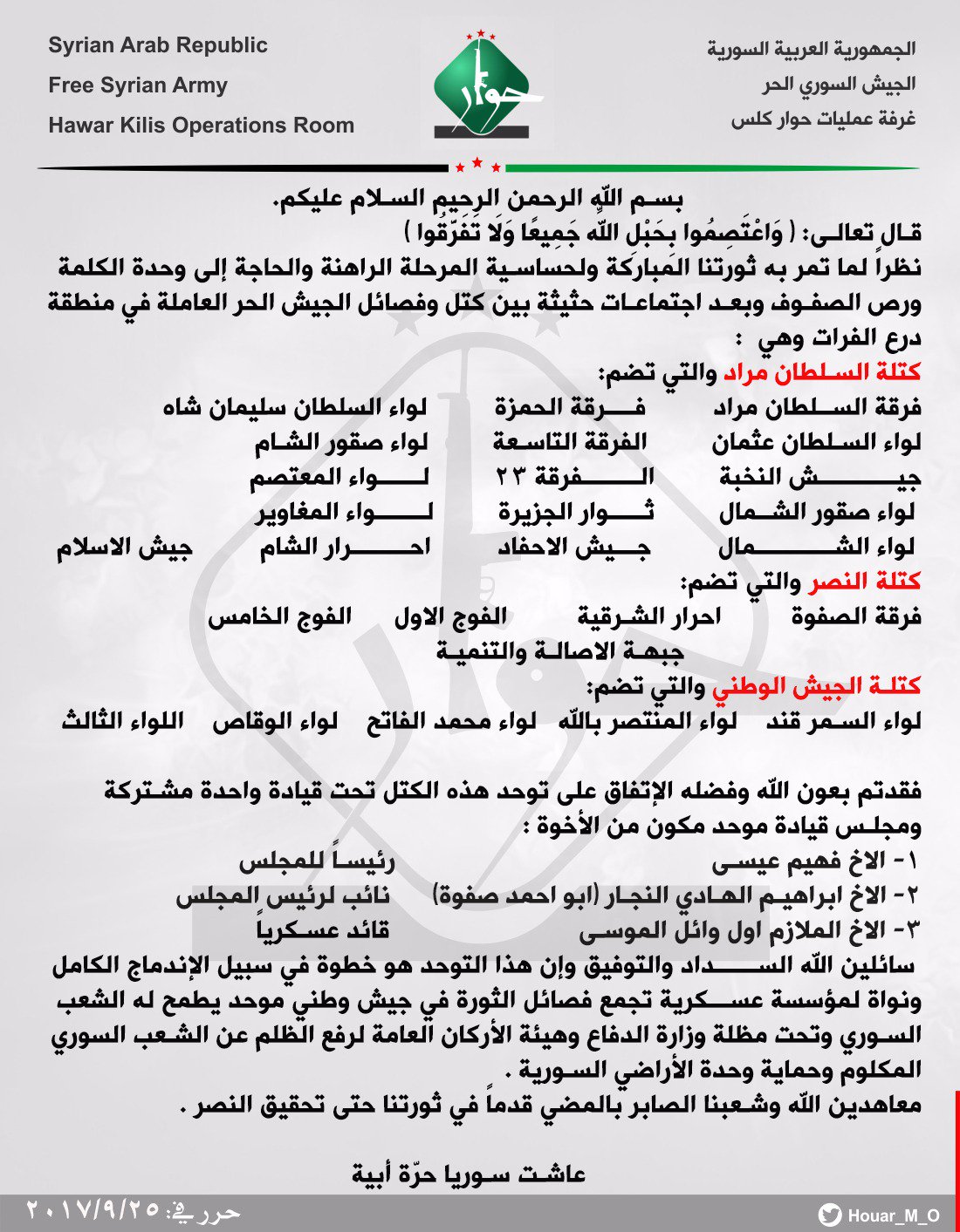 بيان توحد عدة فصائل في ثلاثة كتل تابعة للجيش الحر وتحت قيادة واحدة