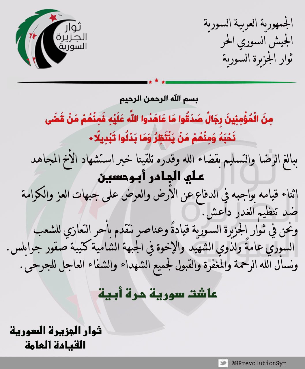 ثوار الجزيرة السورية تعزي الجبهة الشامية بعلي الجادر أحد قادتها أثناء الإشتباكات مع تنظيم الدولة